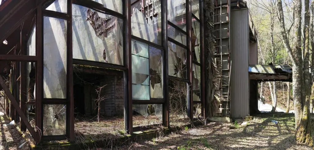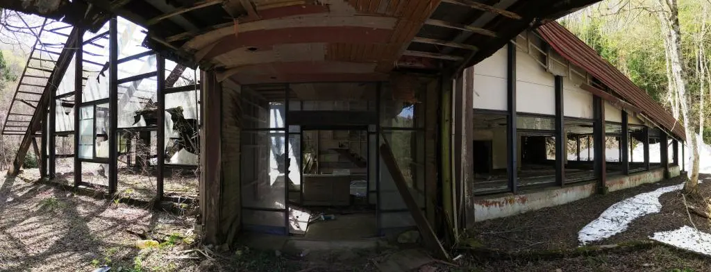 In the mountains of Miyagawa, one of the Hida City's valley villages, there are the ruins of a failed development project known as the Nikoi Kougen Resort or Nikoi Plateau Resort. The existing building, and only actual constructed building, was to be one part of a resort area including a gold course, ski resort, archery courses, rental villas, a hotel, boating pond, an amusement park, limestone cave viewing, and more. So many hopes and dreams that had ultimately failed before the first phase had even been completed.