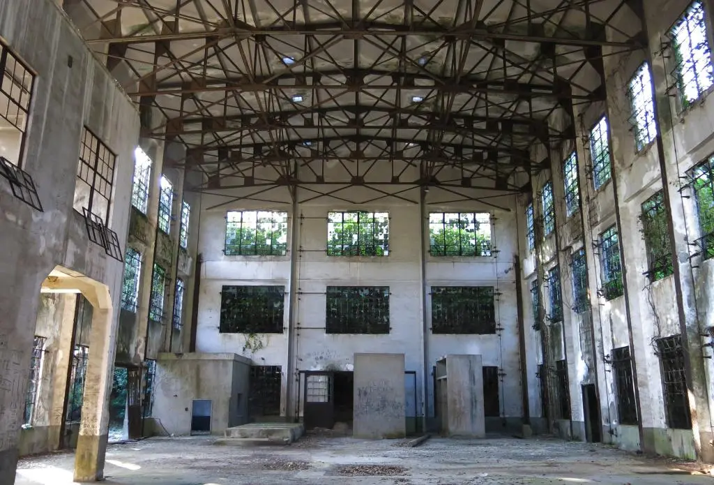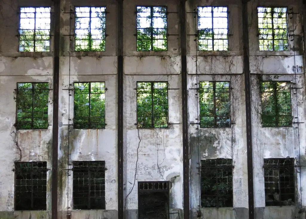 Translated as: This building is the remains of a power plant that supplied electricity when poison gas was produced on Okunoshima (1929-1945). At the time, eight diesel generators, which can be seen in both photographs, were installed, all of which ran on heavy oil. This building was also used to inflate the balloons for the balloon bombs used in Operation Fu-Go and to repair any weak parts. The balloons used were made by mobilized female students by pasting together pieces of washi paper with konjac paste.