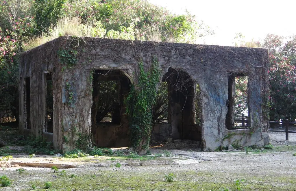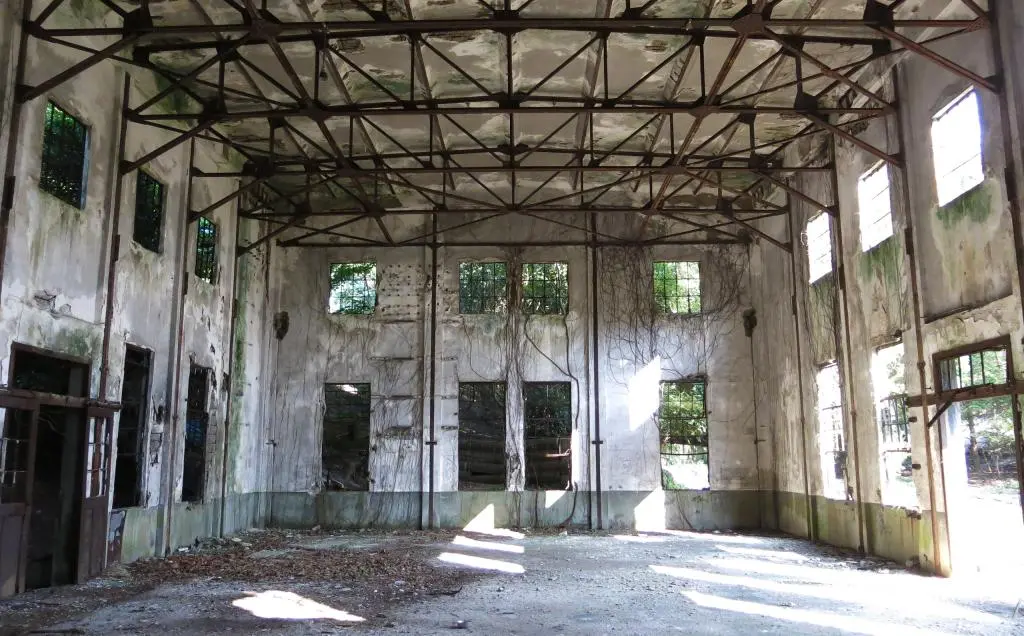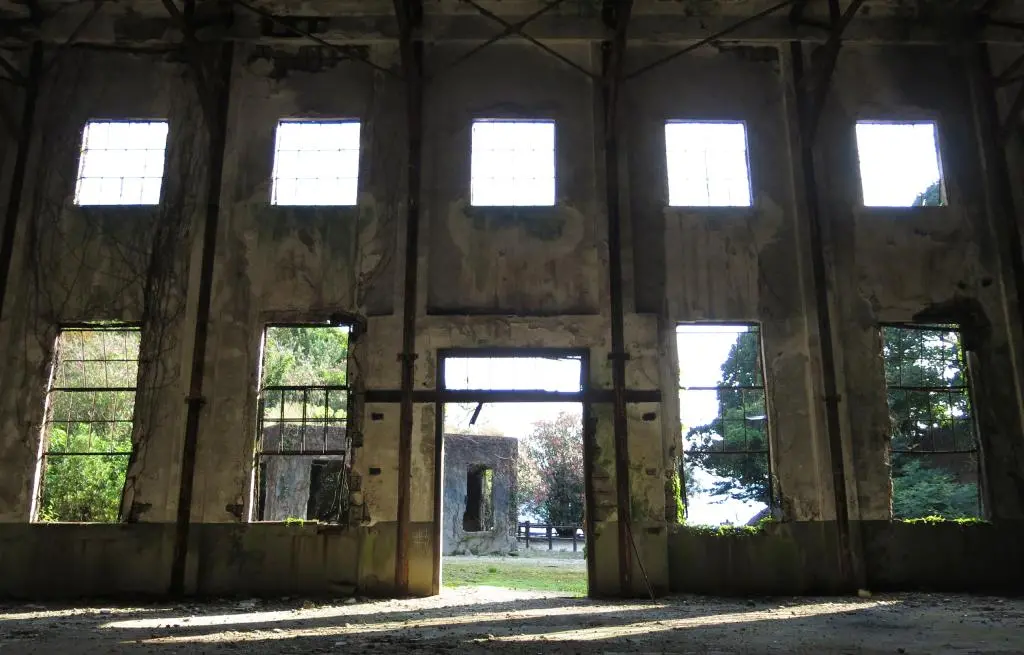 On the east end of the island, next to the dock for the ferry, there is the standing remains of the power plant used to power the poison gas facility.