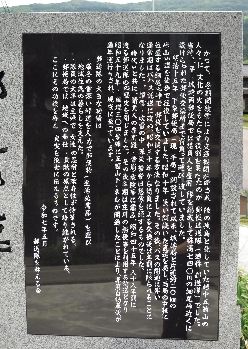 The Hosoo Pass Postal Exchange Office 細尾峠郵便交換所 was one of the places I visited when I explored Hosoo Pass. I went there on June 3rd. It turns out that just a days prior on May 31st, they held a dedication ceremony for the creation of a monument devoted to the Taira Postal Corps in Taira Village.