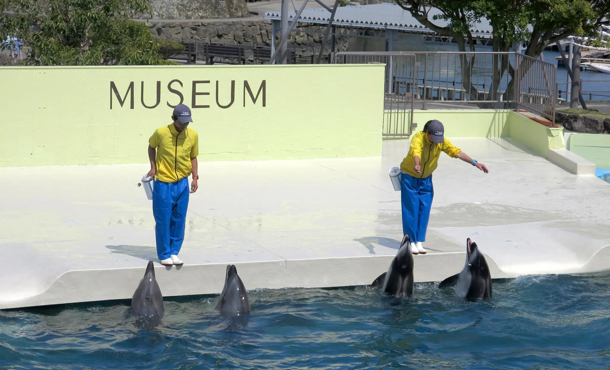 The trainers gave their commands, and the dolphins swam around, and jumped around. They did their tricks and got their small treats as rewards.