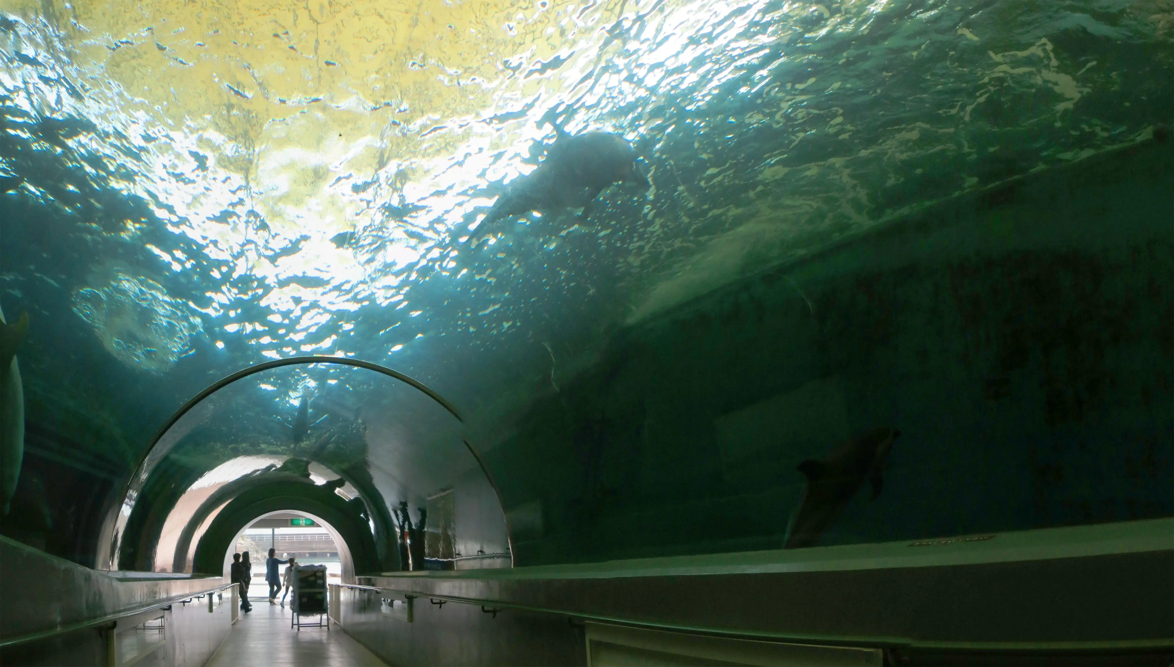 It's a cylindrical structure surrounding a tank. As you enter, a tube guides you through the bottom of the tank, and you have a 360 view of the baby dolphins swimming around. It seemed like more of a holding area, or a temporary pen before they could join the rest of the dolphins in the natural pen.
