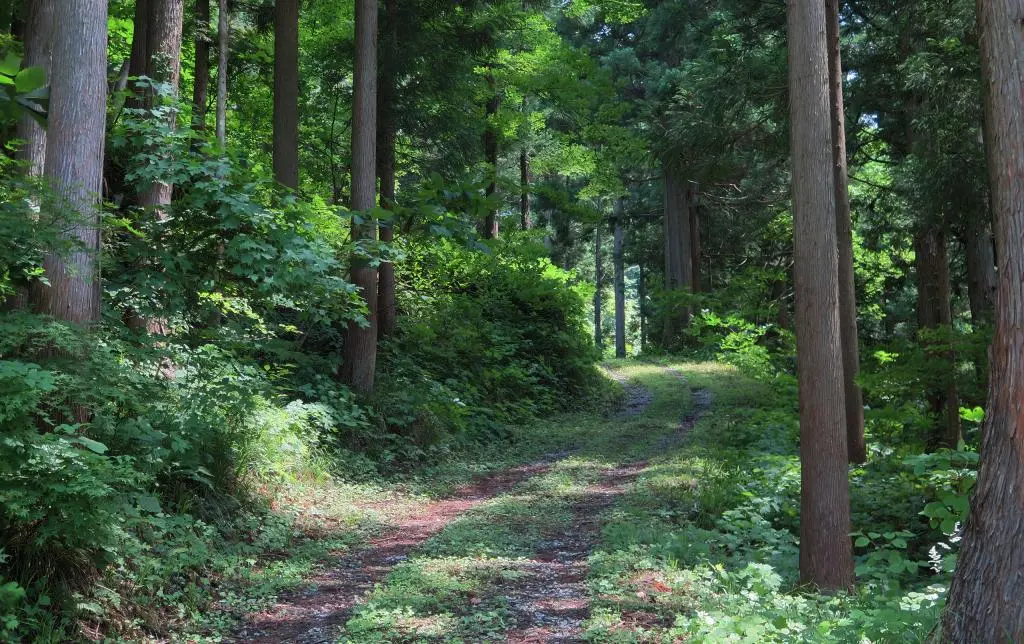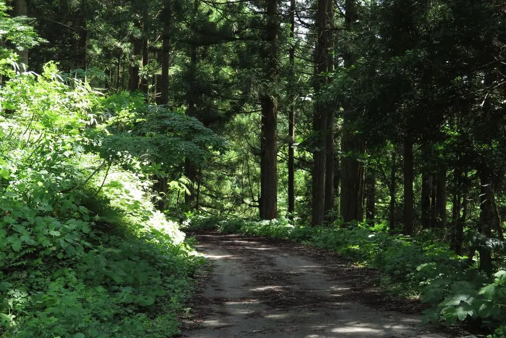 The side road continues past the restaurant into the forest, and eventually ends with the forest engulfing the road. I wasn't paying attention to the map, so I didn't realize that I went past the shrine quite a while ago. Going back to the restaurant, the shrine is located up on the hill behind the area. You can see it from the road peering through the trees.